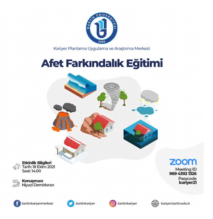 Kariyer Planlama Uygulama ve Araştırma Merkezi 2021 - 2022 Akademik Yılı Güz Dönemi etkinlik planı kapsamında, Üniversitemiz öğrenci ve mezunlarının afet farkındalığı konusunda bilincini artırmak ve bu konudaki faaliyetlerin yaygınlaştırılmasına katkı sağlamak amacıyla 18 Ekim 2021 Pazartesi günü Saat 14.00'de Zoom Meeting uygulaması üzerinden çevrimiçi olarak Bartın İl Afet ve Acil Durum Müdürlüğü Arama Kurtarma Teknikeri Niyazi Demirkıran'ın anlatımıyla Afet Farkındalık Eğitimi gerçekleştirilecektir.
