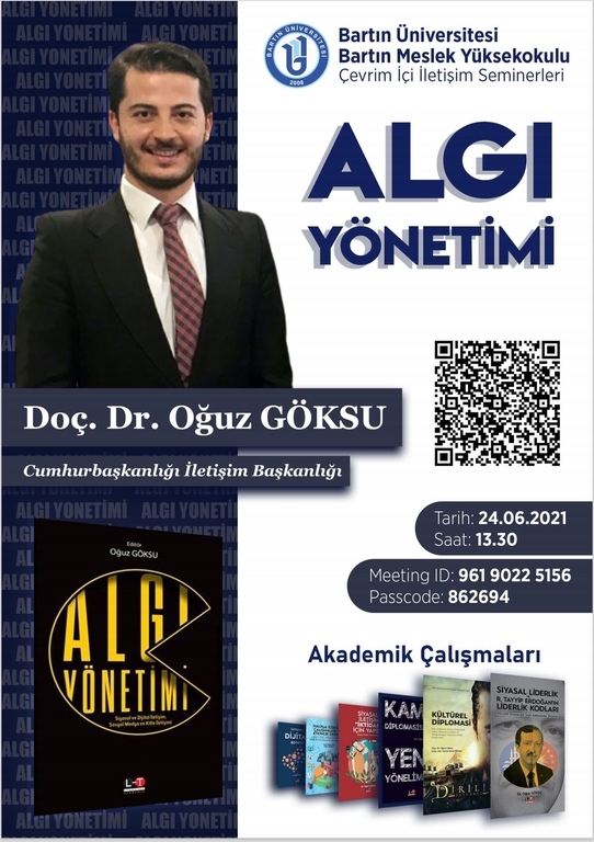 Bartın Meslek Yüksekokulumuz çevrim içi iletişim seminerleri kapsamında Cumhurbaşkanlığı İletişim Başkanlığından Doç. Dr. Oğuz Göksu, 24 Haziran saat 13.30' da “Algı Yönetimi” semineriyle bizlerle olacaktır.